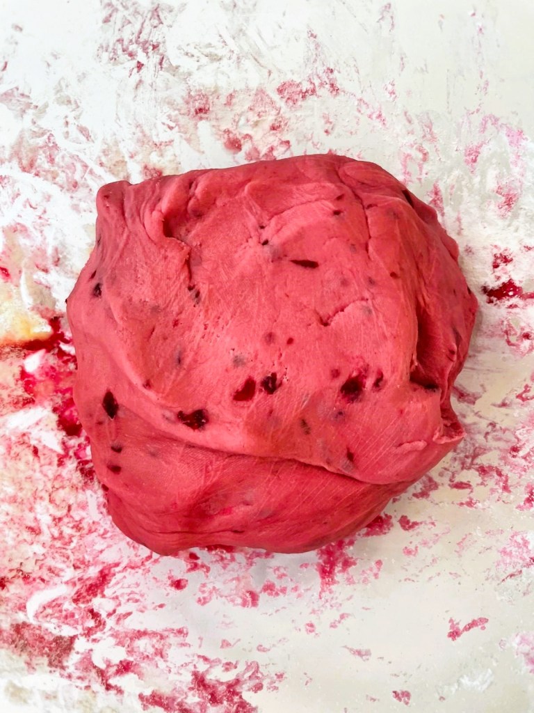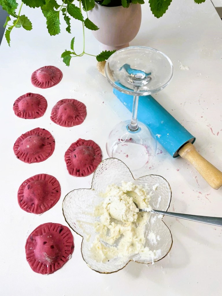 Zacznij od zmiksowania ugotowanego buraka – u mnie nie zmiksowałam go idealnie, więc zostały drobinki. Ale dzięki temu ciasto zyskało ciekawą teksturę. Zmieszaj z jajkami, dodaj mąkę i sól. Zagnieć elastyczne ciasto, owiń folią i daj mu odpocząć minimum 30 minut.