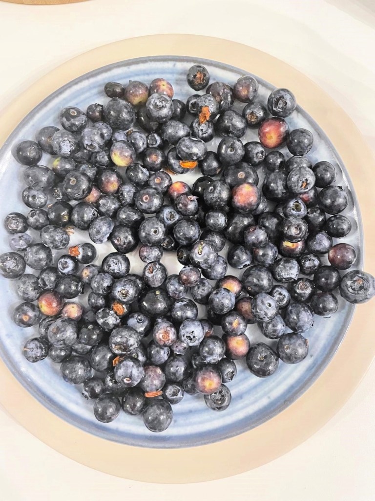 - 2–3 łyżki soku z przetartych przez sitko zblendowanych borówek