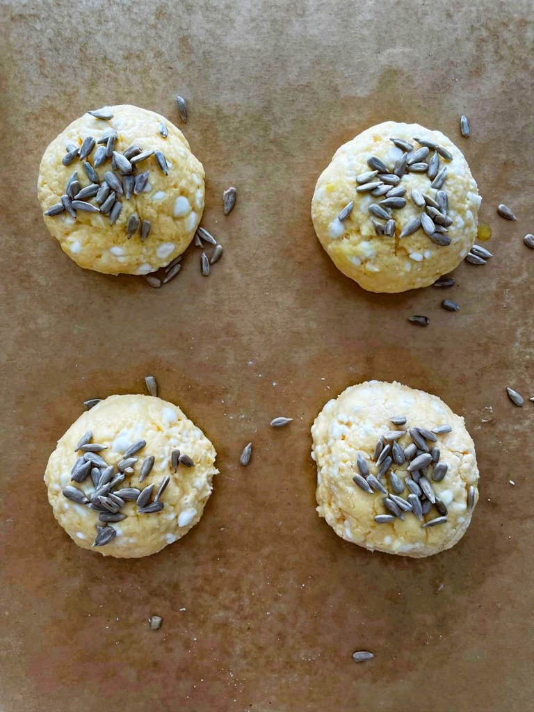- Uformuj 4 bułeczki, ułóż na blaszce wyłożonej papierem do pieczenia.