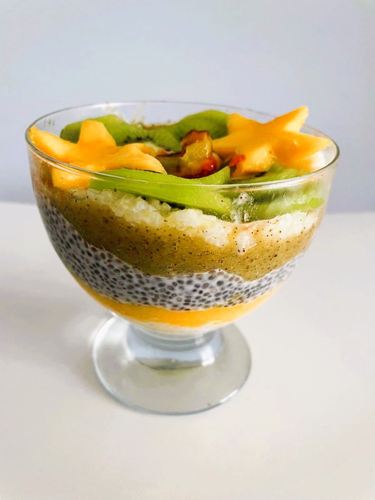 - ryż → mus mango → nasiona chia → mus kiwi→ ryż→ owoce do dekoracji: mango, kiwi, figa